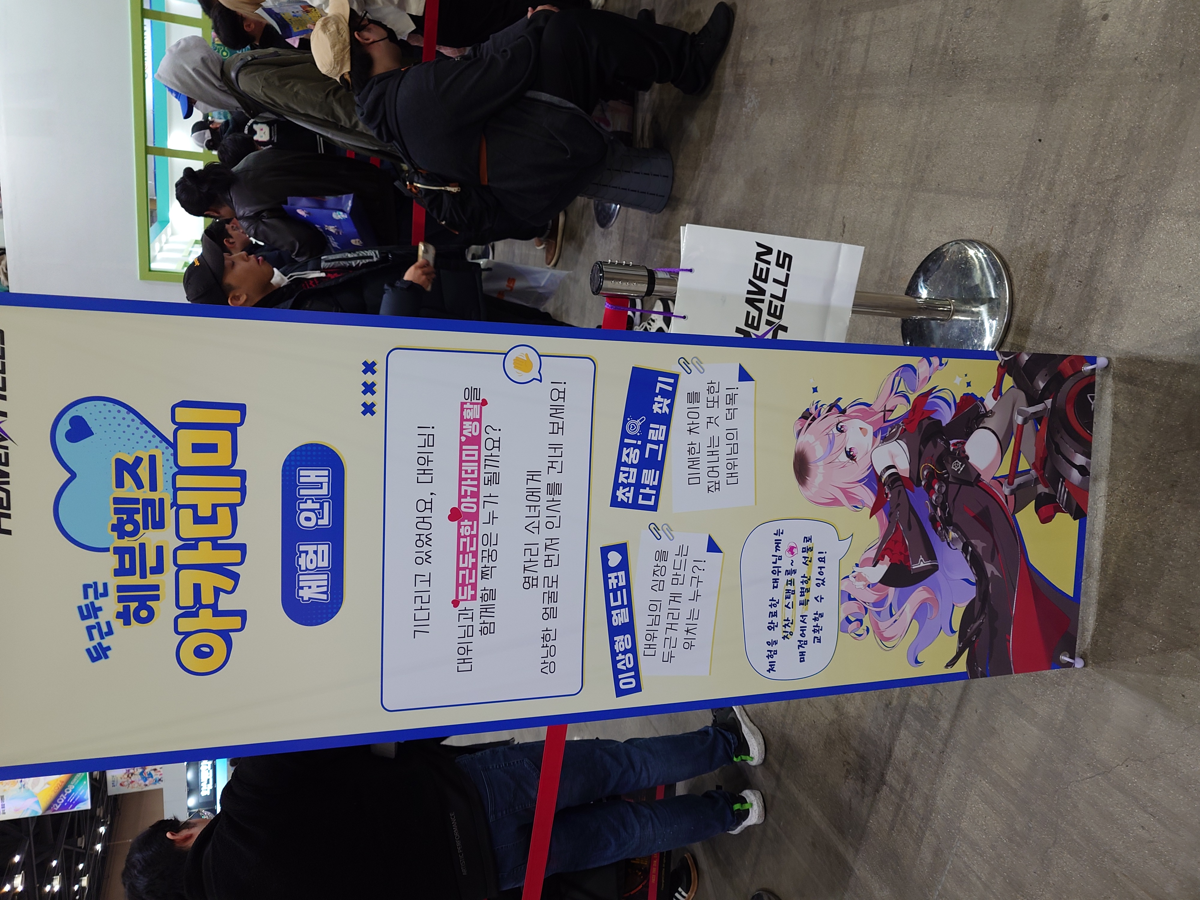 서코같은 동인 위주의 행사와 다르게 기업 몇개의 부스를 바탕으로 대관을 하는 거다 보니 부스간 간격이 엄청나게 크고 그 넓은 간격으로 의자나 앉을 자리는 하나도 없어서 바닥에 앉아야 하고 부스 꾸미는 퀄리티들도 아무래도 높아요.